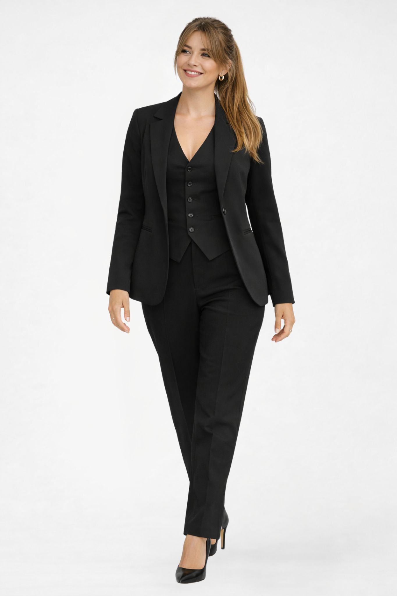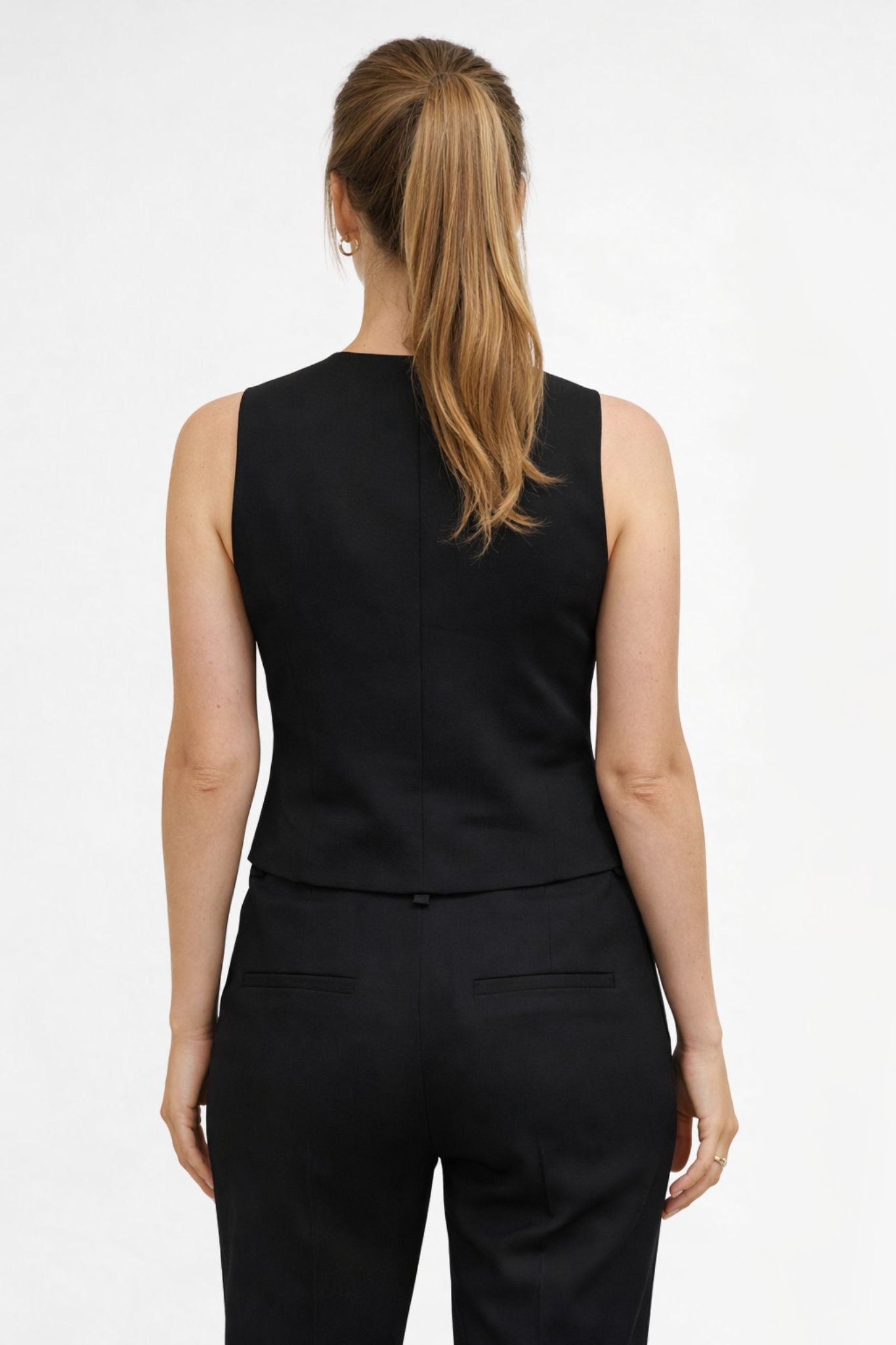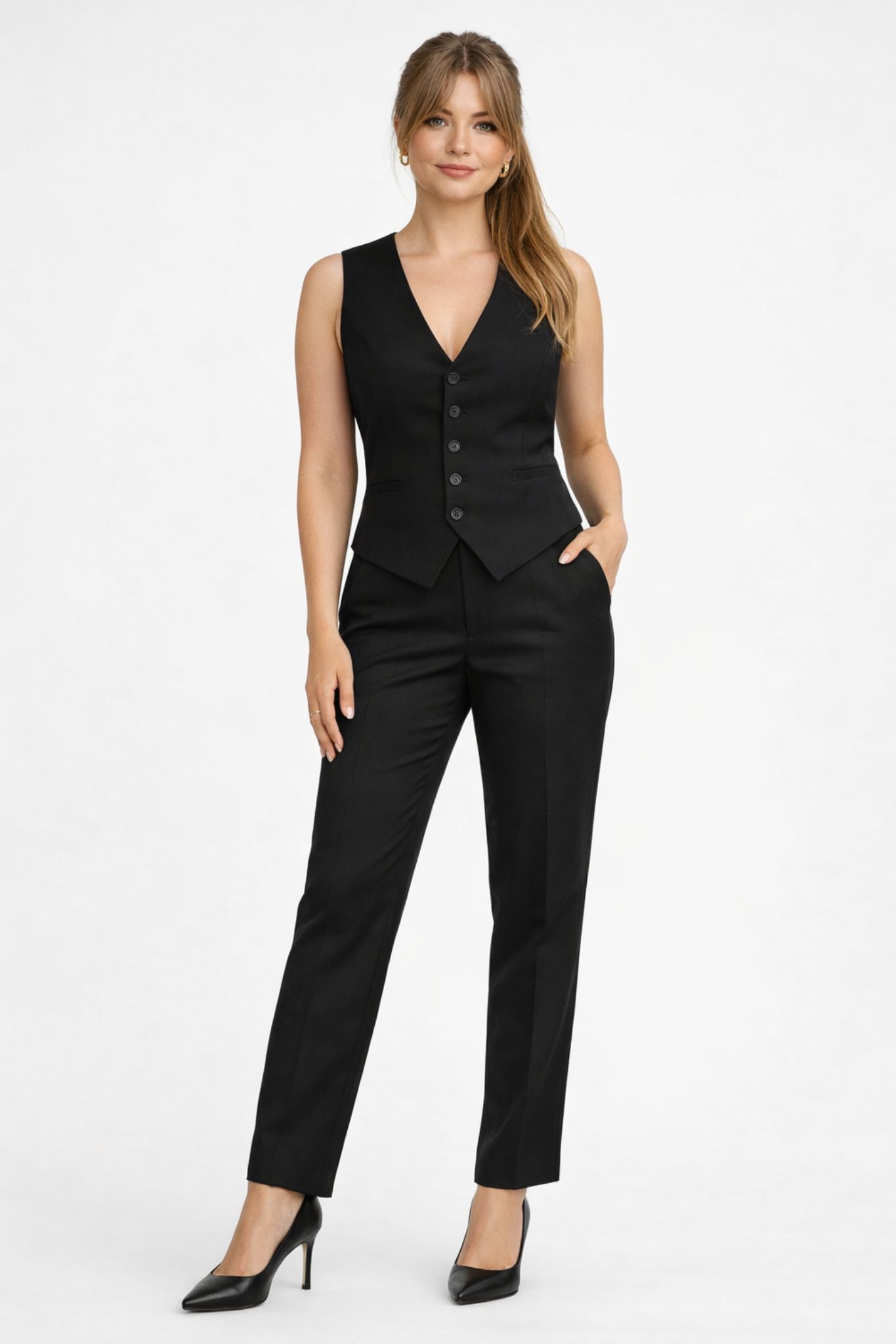Skräddad väst med V-ringning, fem knappar och två smala fickor.