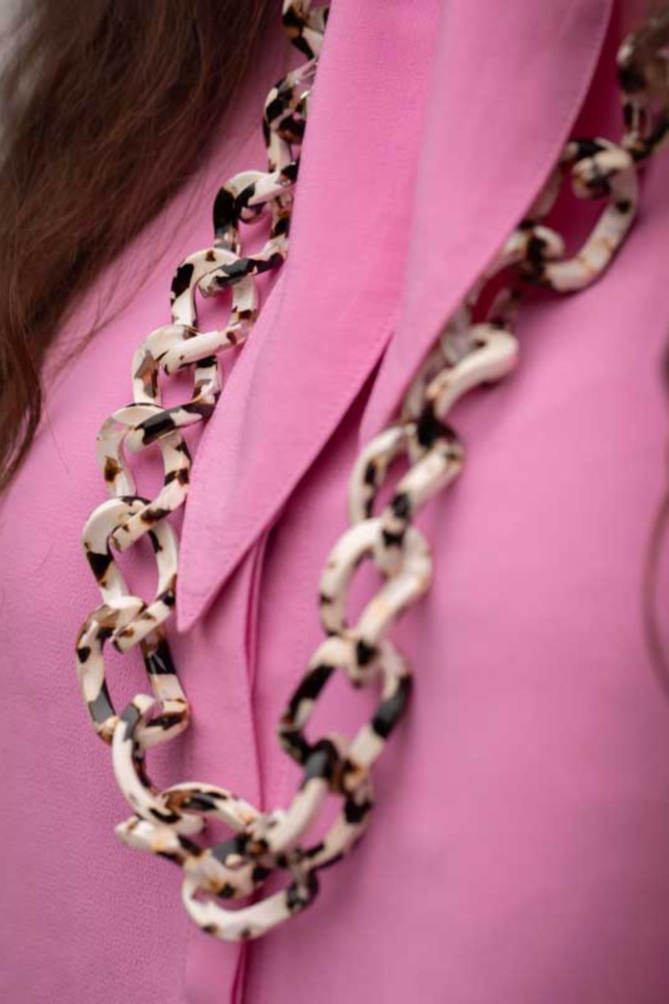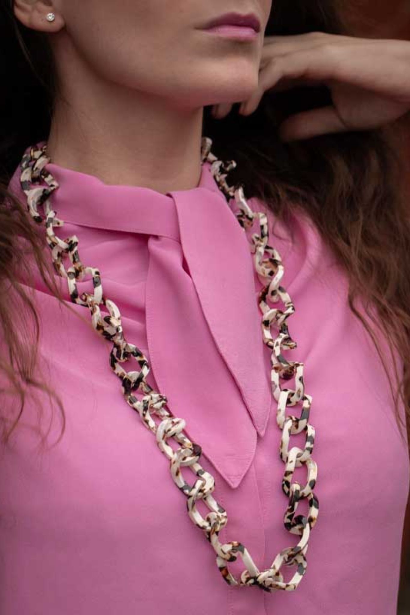 Ett långt resinhalsband som är melerat i brunt och beigevitt.
