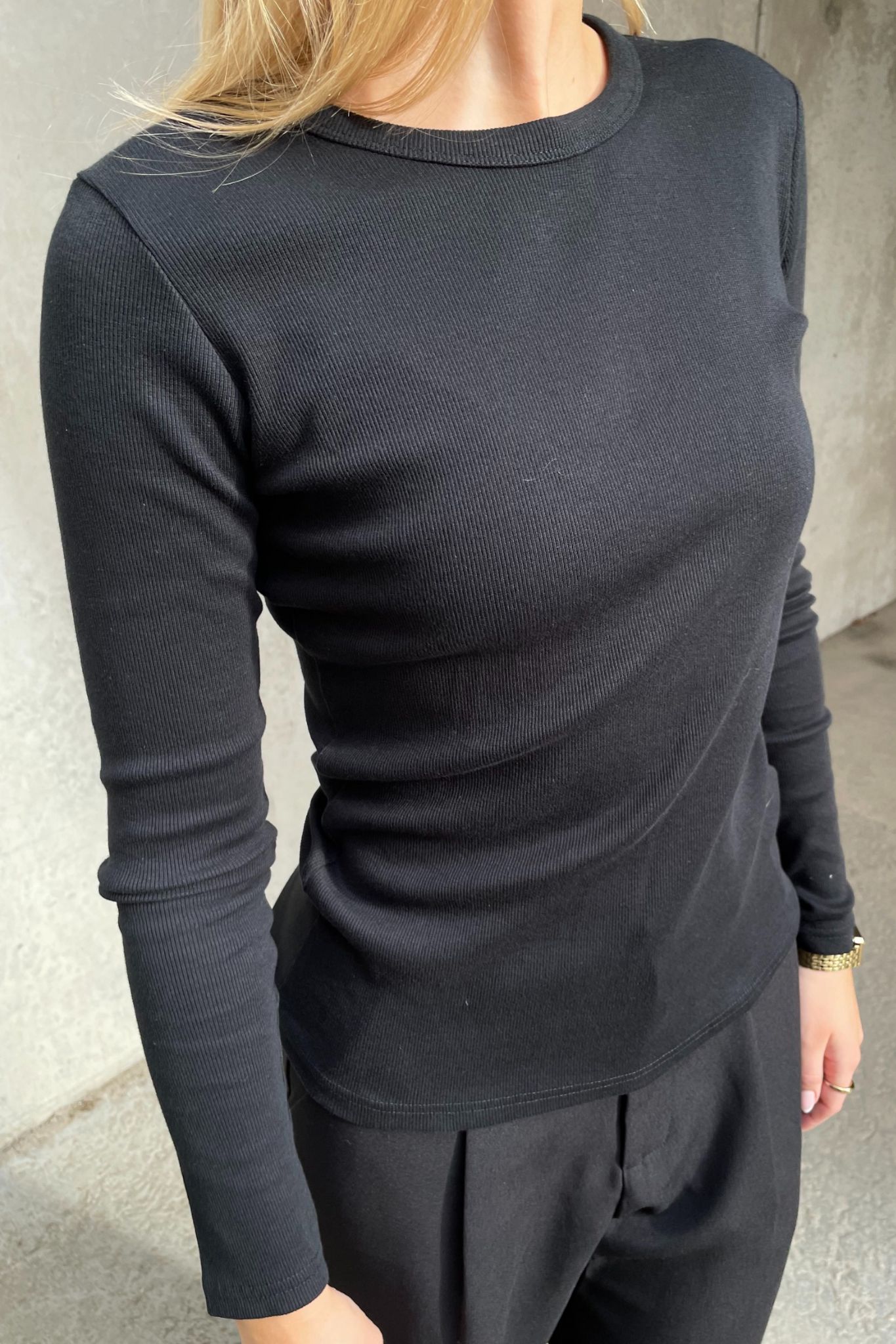 Ribbad tröja med rund hals och långa ärmar.
