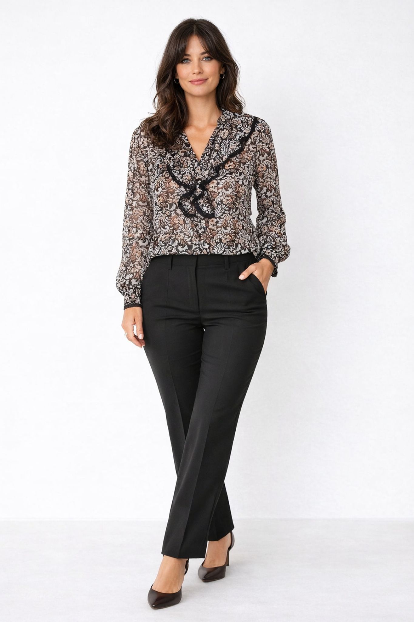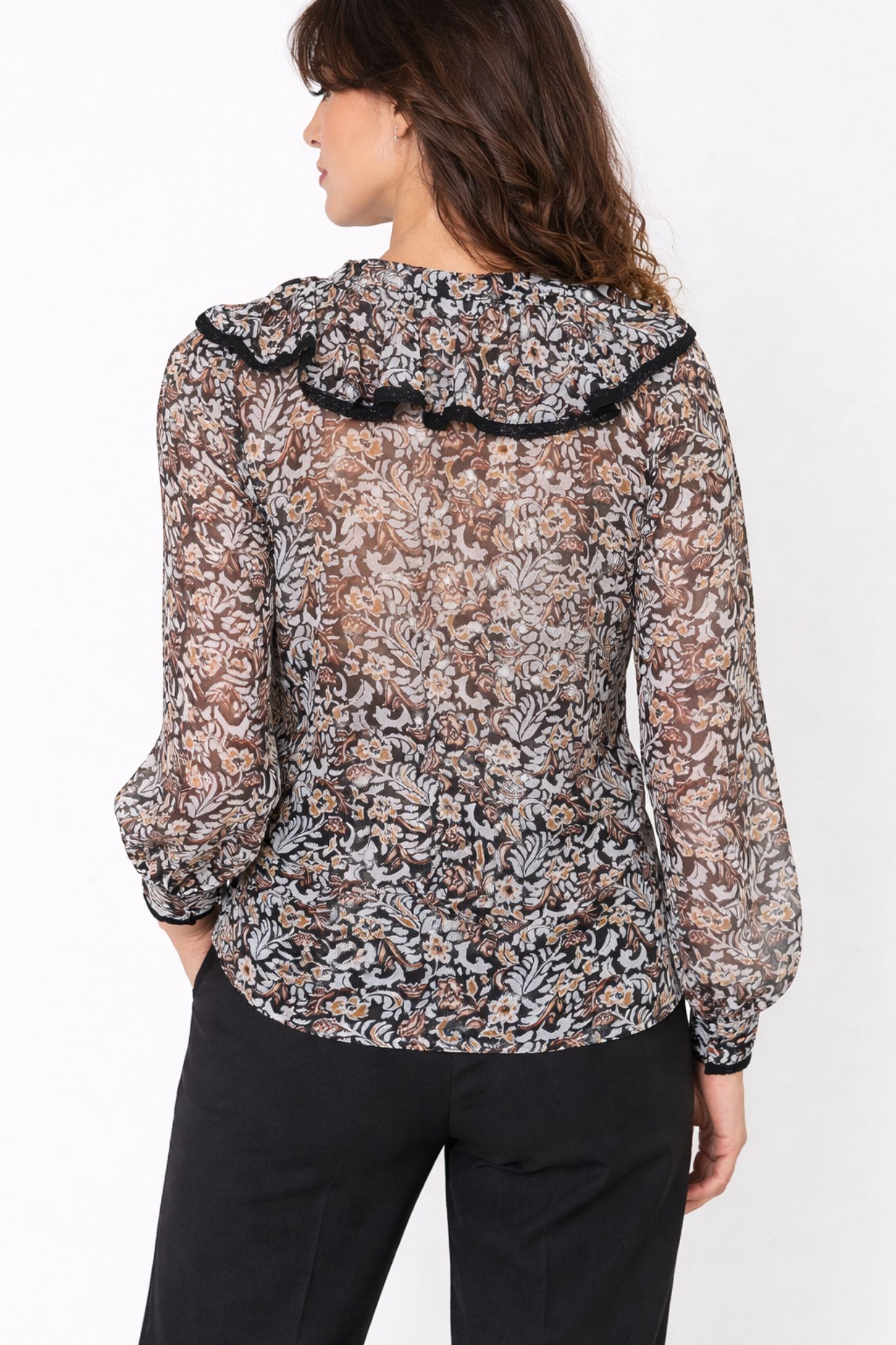 Transparent blus med mönster och V-ringning.