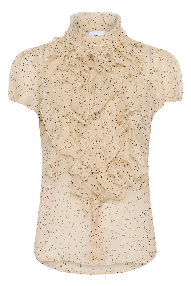 Volangblus i meshkvalitet som stängs med knappar längst framsidan, något figursydd modell med liten ryschprydd hals och påsydda volanger på bröstet. Korta ärmar med elastiskt ärmslut. Gjord i semitransparent chiffong.