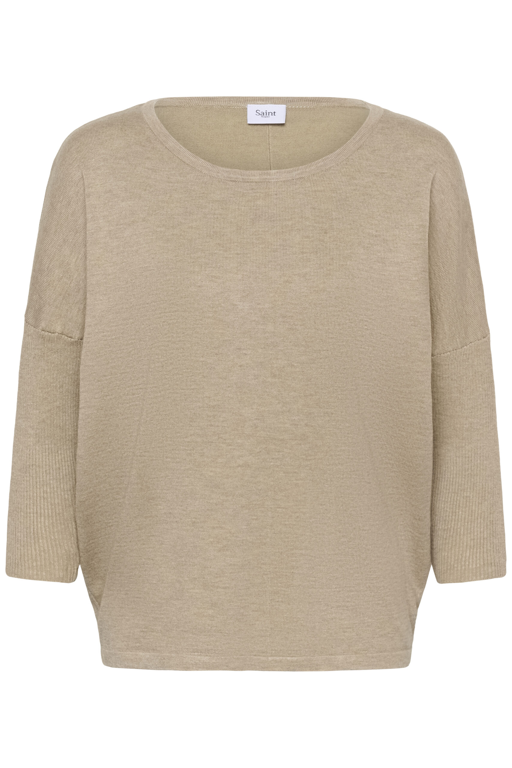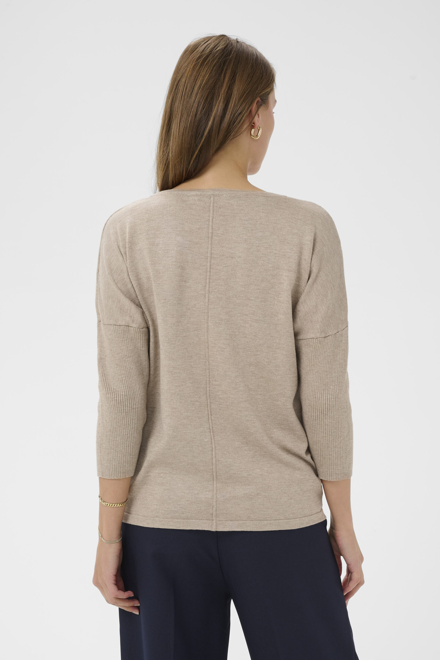 Nedhasade axlar och 3/4-långa ärmar i ribbstickat.