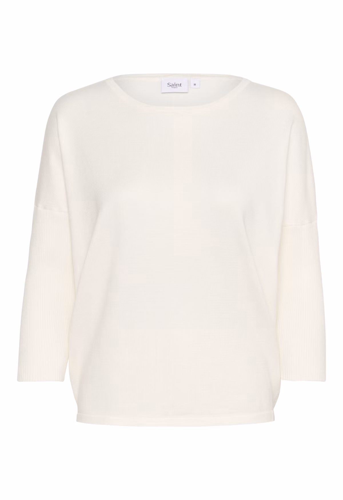 Nedhasade axlar och 3/4-långa ärmar i ribbstickat.