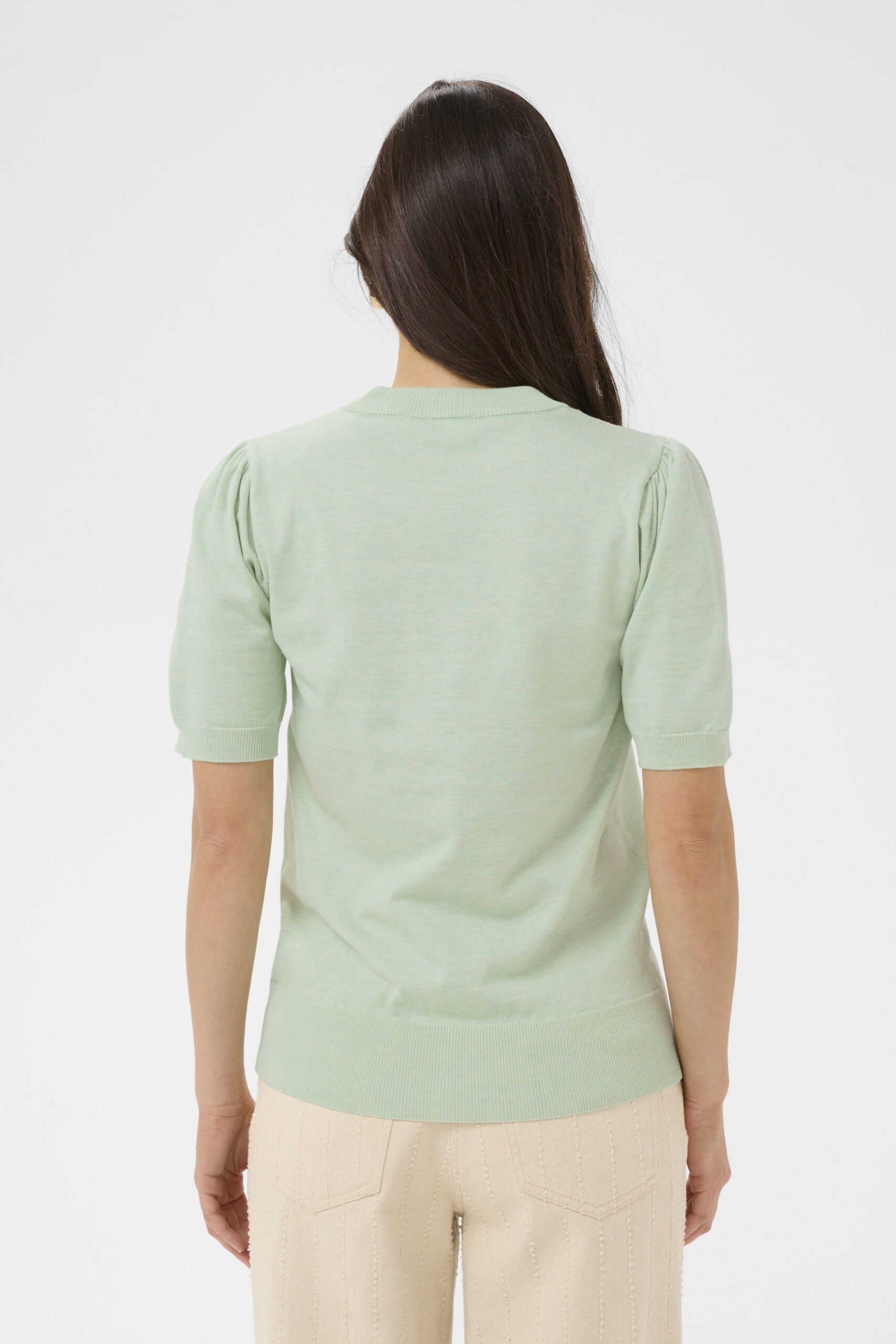 Stickad topp med lätt figursydd passform och rynkdetalj på axlarna.