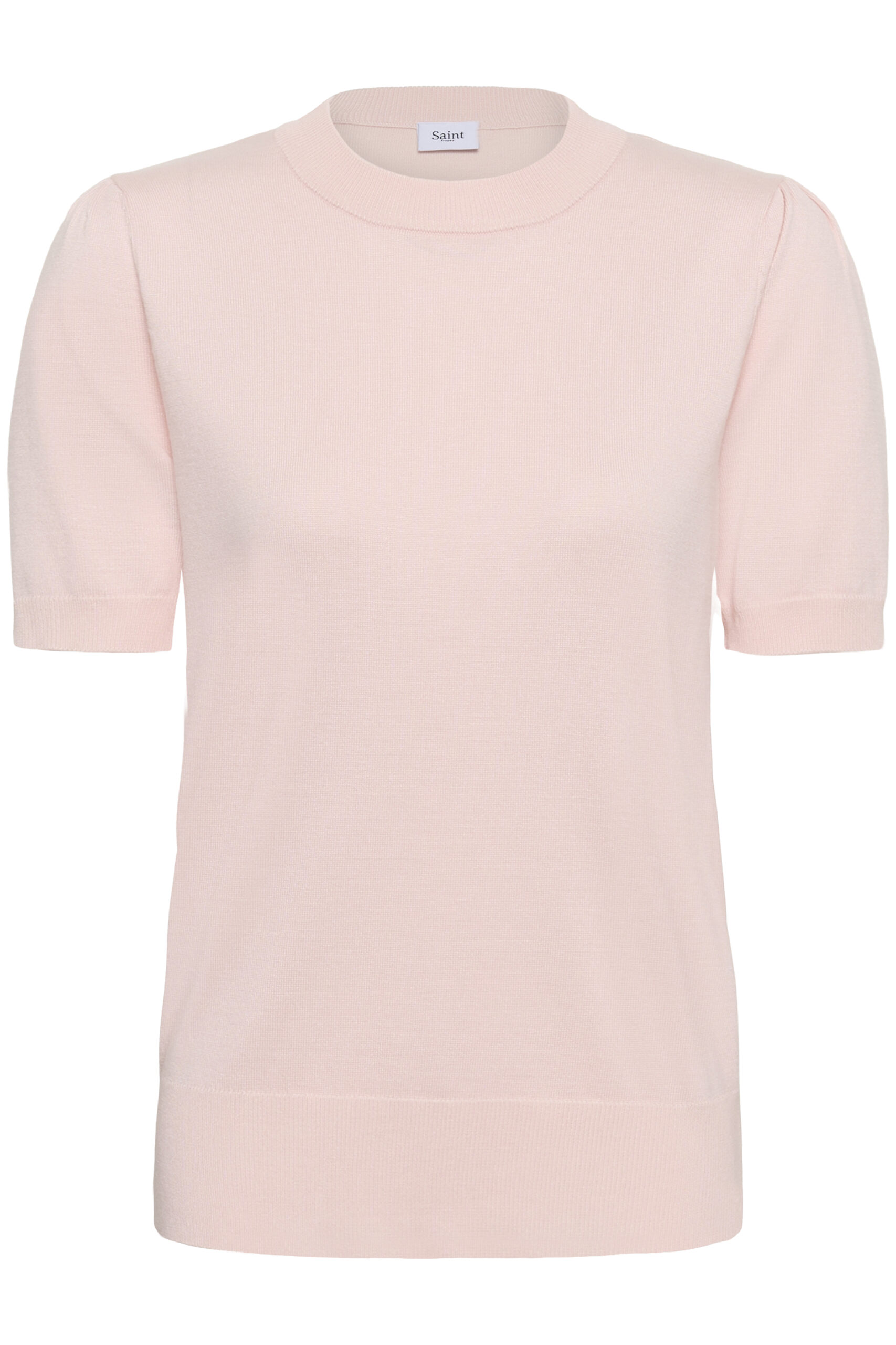 Rund hals och korta ärmar med ribbade muddar i ärmslut och nederkant.