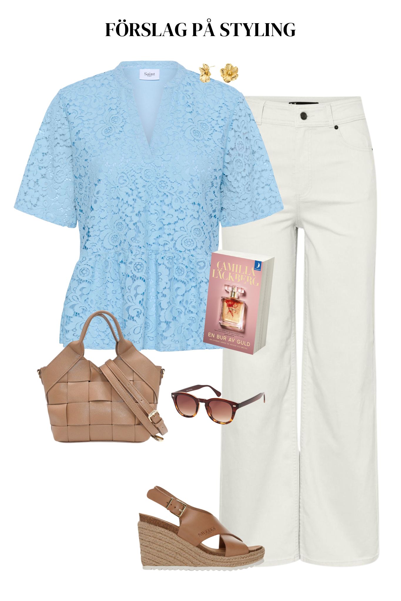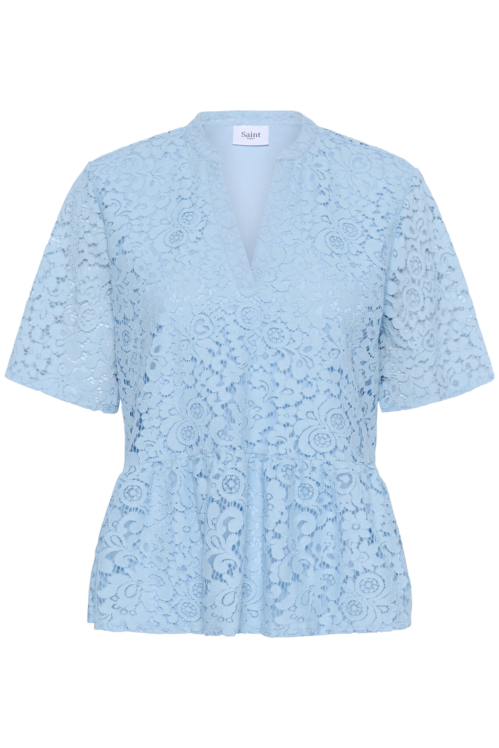 Kortärmad spetsblus i avslappnad peplumform med blommönster och v-ringning.