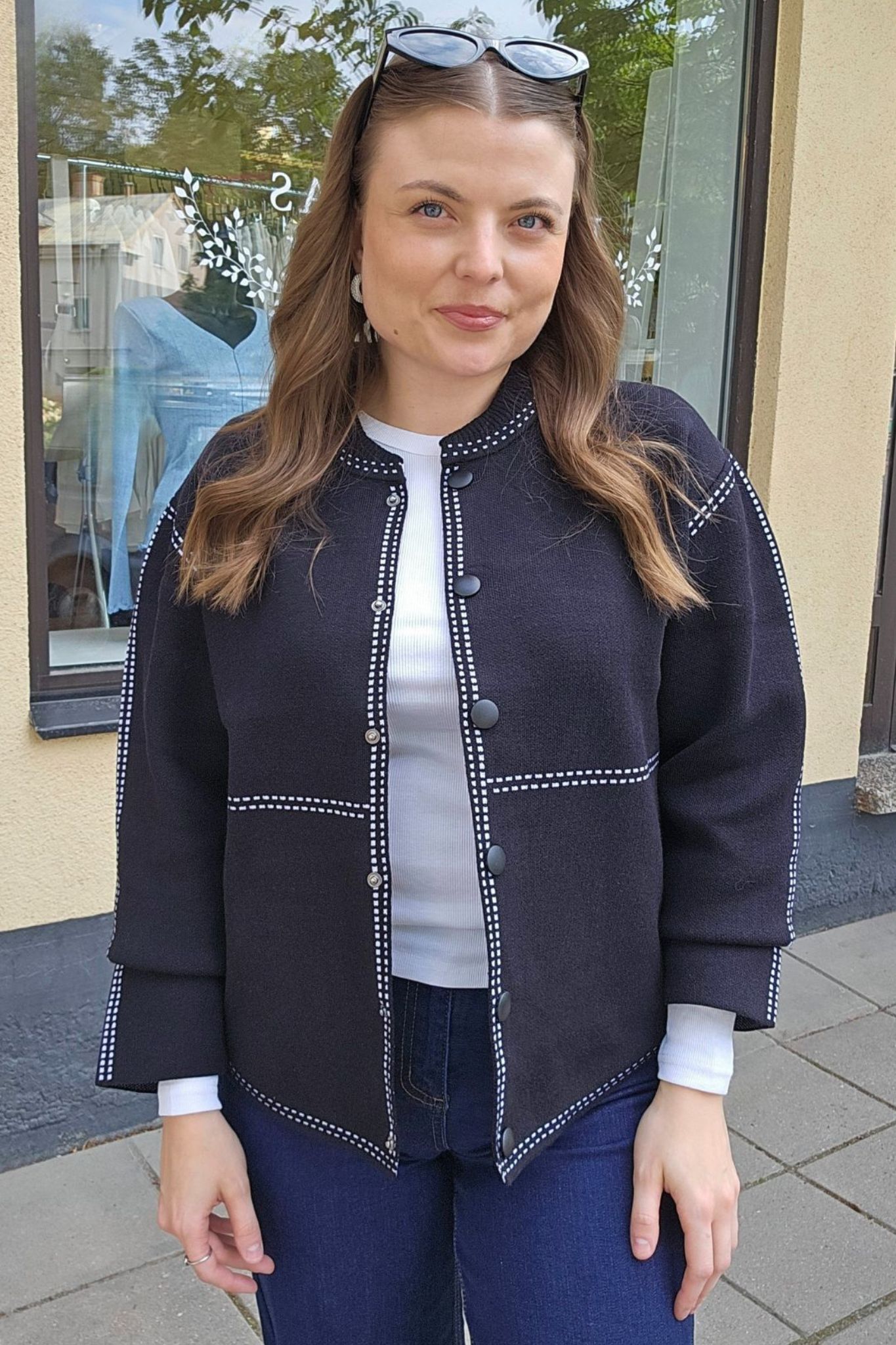 Stickad kofta i kraftig kvalitet med dekorativa sömmar och tryckknappar.