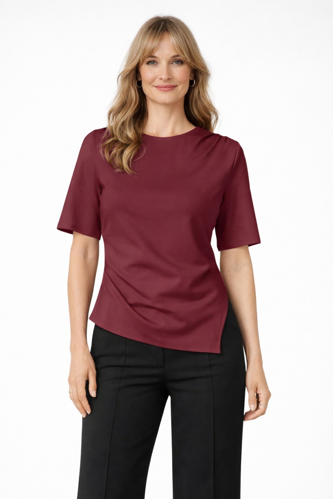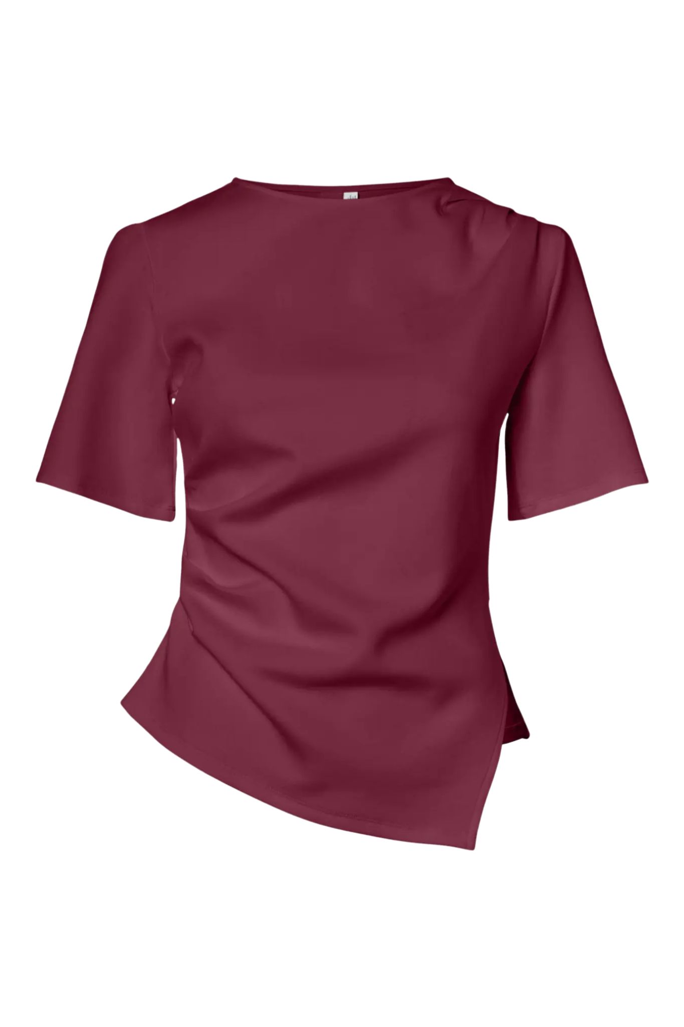 En asymmetrisk topp i stretchigt jerseytyg, rund hals och 2/4-ärmar.