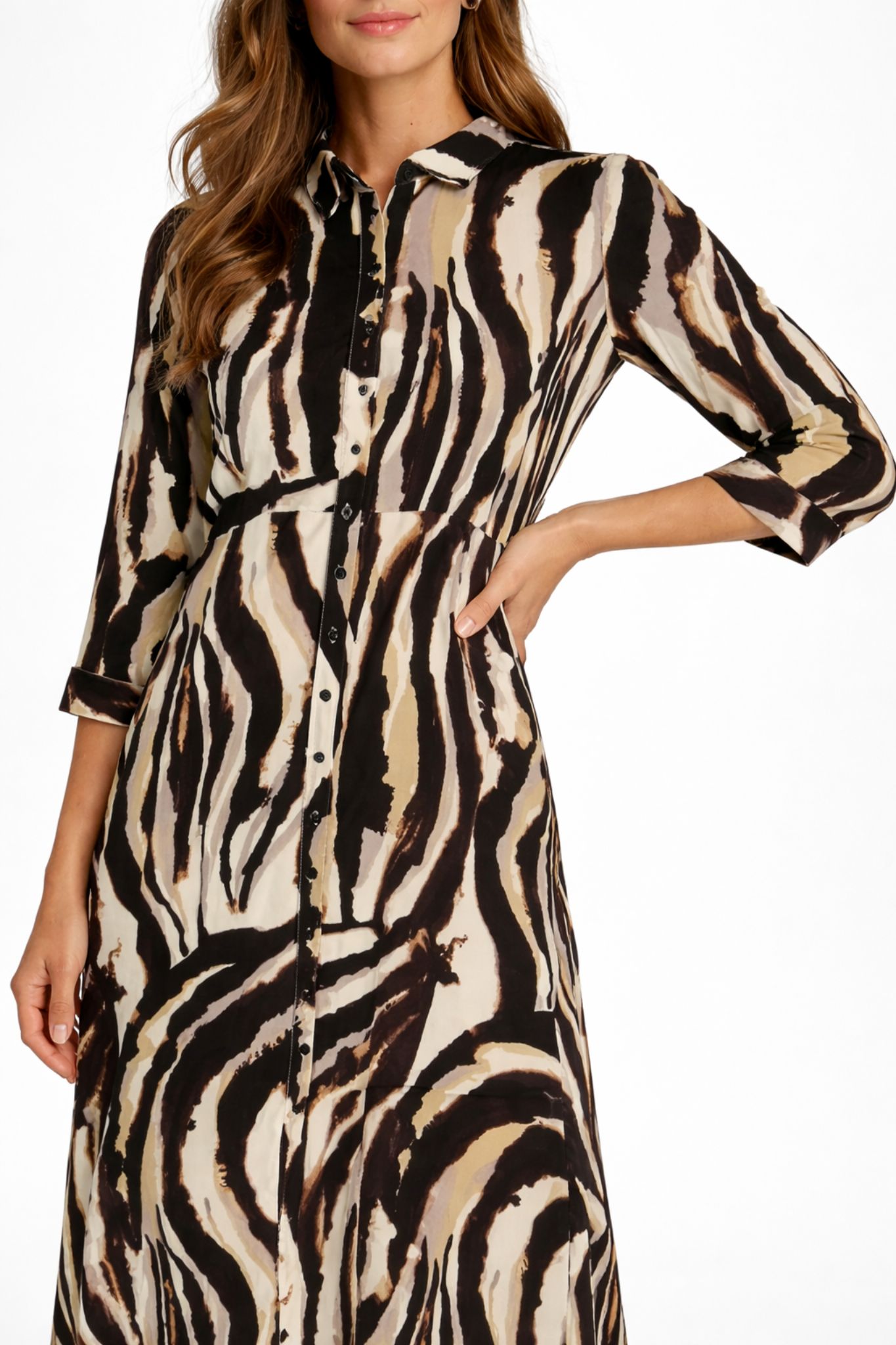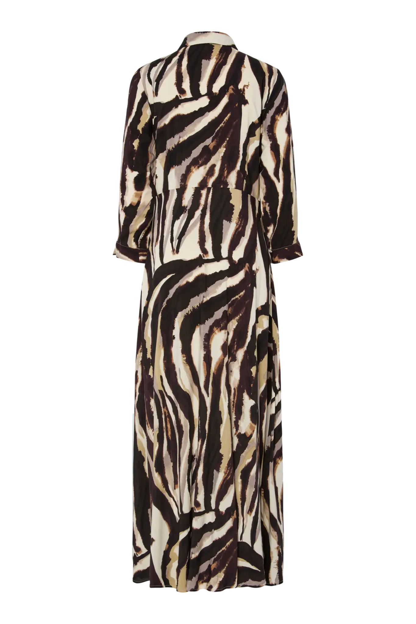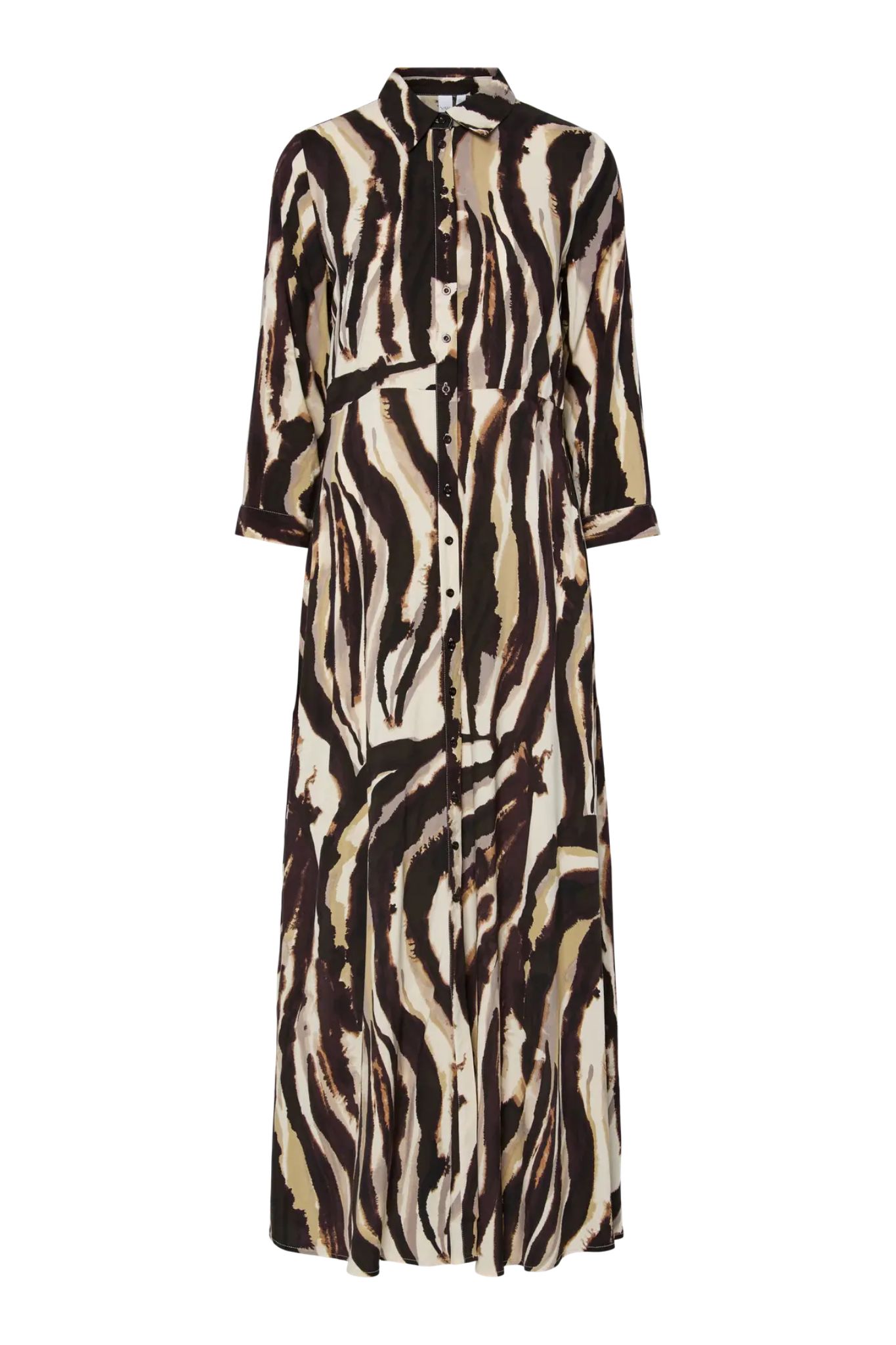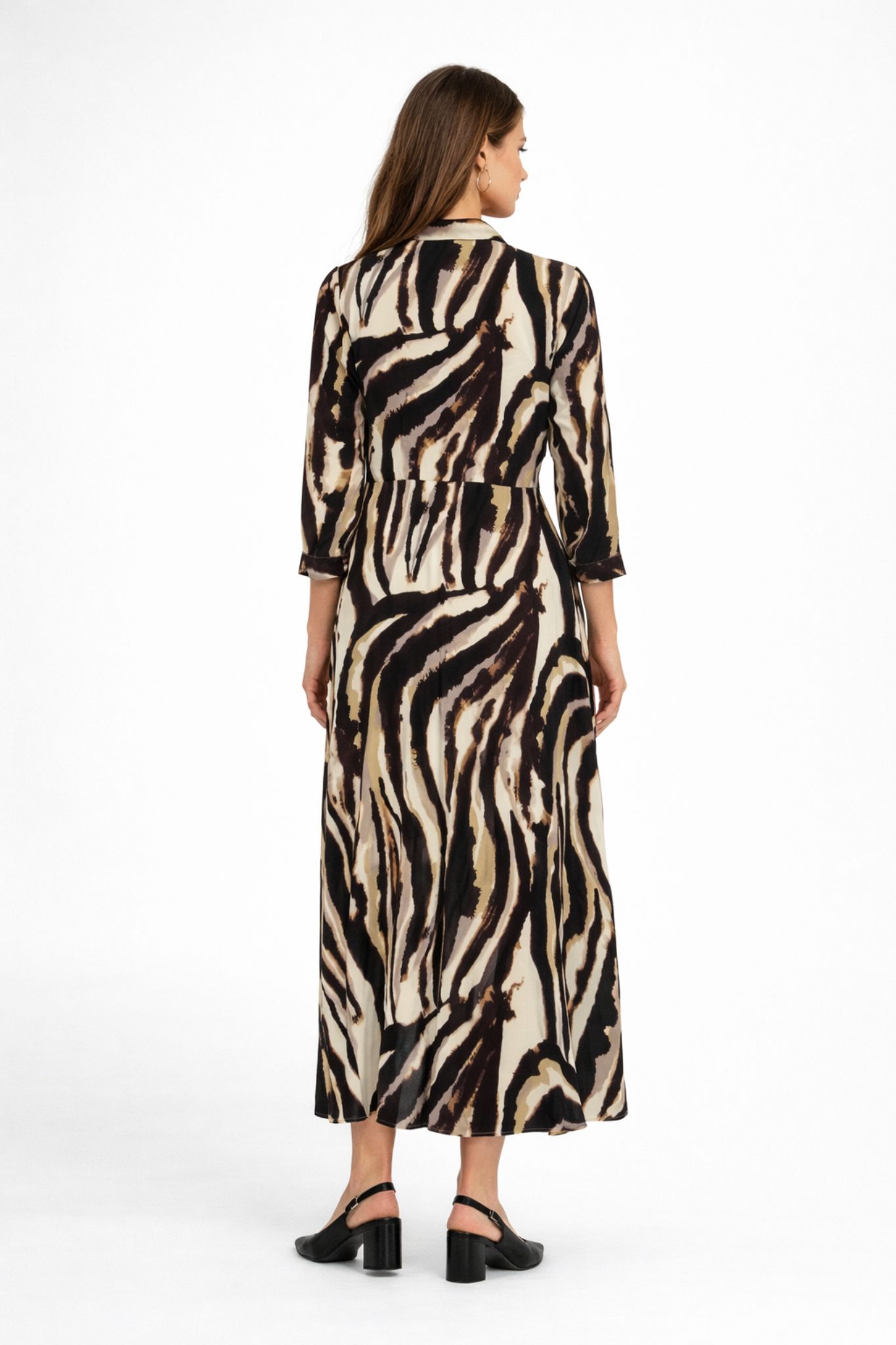 Lång klänning med skjortkrage, markerad midja och 7/8-ärmar.