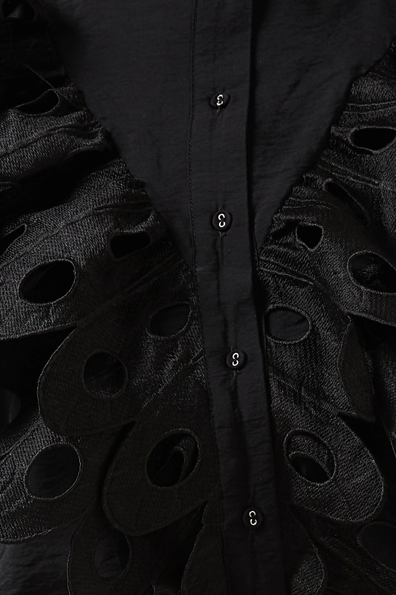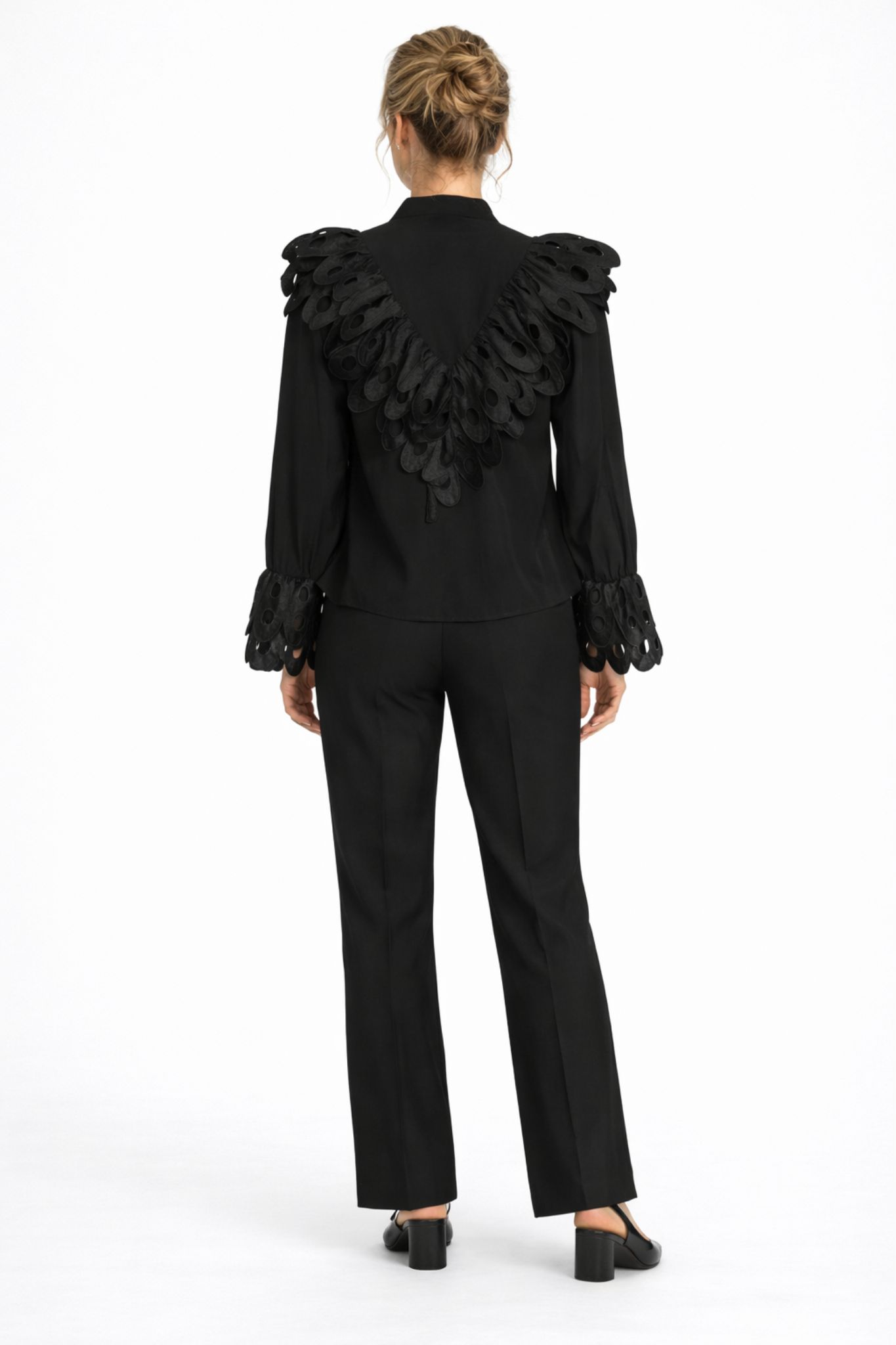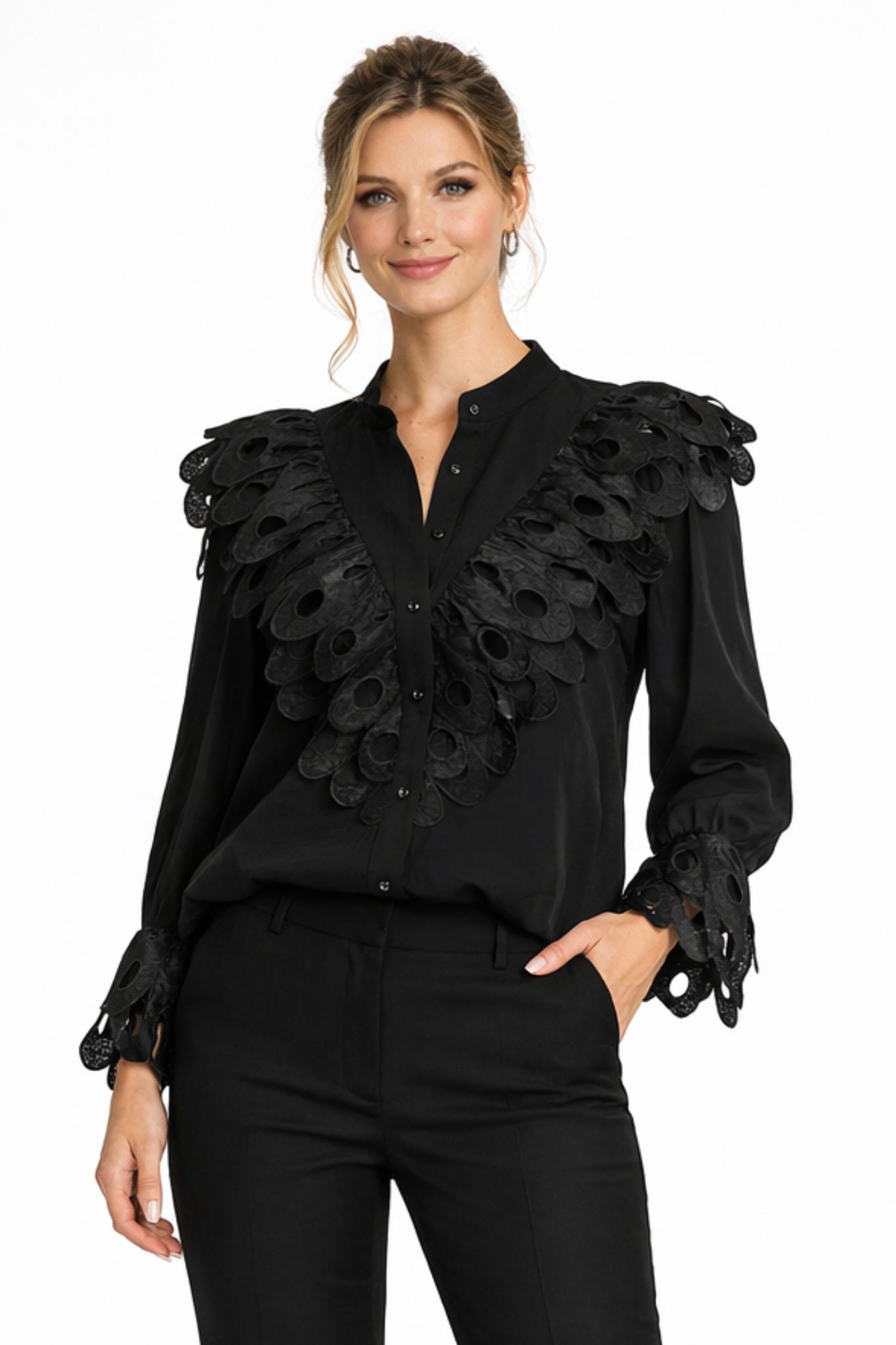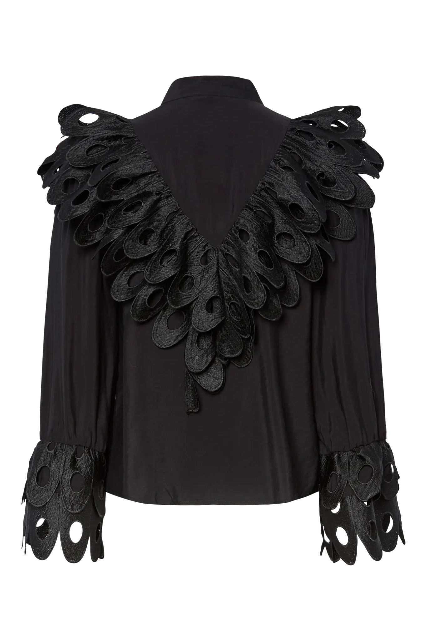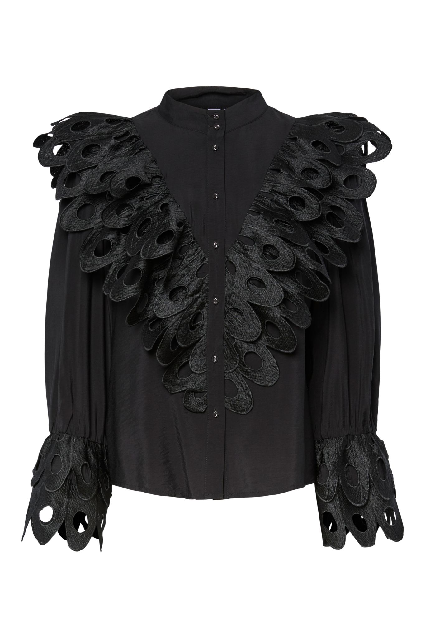 Blus med långa ärmar och knappmanschetter. Diskret V-ringning med knappslå framtill.